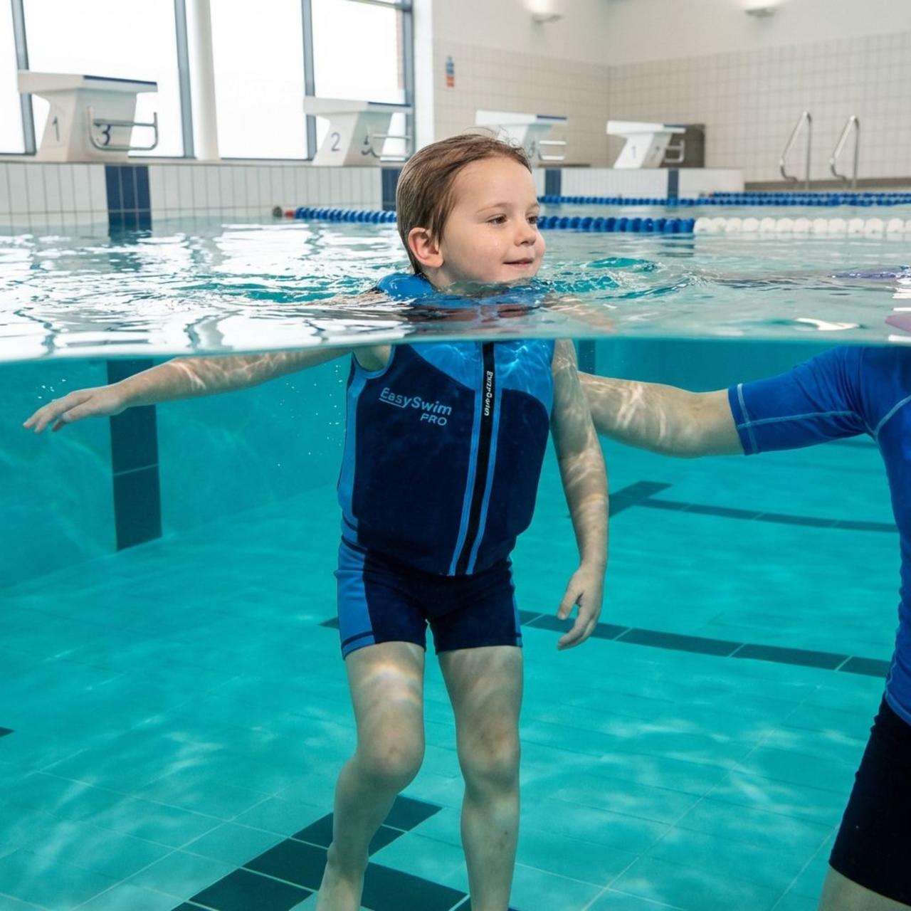 In diep water leren kinderen loslaten en vertrouwen op zichzelf. In plaats van dicht bij de rand te blijven, dragen ze een speciaal ontworpen drijfpak dat fungeert als een zachte helper. Dit pak houdt hen rechtop en veilig, zodat ze vrij en comfortabel kunnen bewegen. Drijven in diep water leert natuurlijke balans, helpt kinderen hun eigen drijfvermogen te voelen en voegt een speels en avontuurlijk element toe. Er schuilt iets magisch in de eerste momenten waarin kinderen beseffen dat ze veilig en ondersteund zijn. Plotseling wordt water een plek van ontdekking, nooit angst.