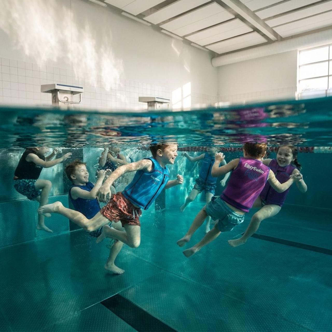 Water geeft een gevoel van vrijheid als nergens anders, vooral wanneer leren begint in een zwembad dat diep genoeg is om te drijven. Met de steun van een drijfpak dat veiligheid én vrijheid biedt, ervaren kinderen hoe hun lichaam reageert op drijfvermogen en zachte beweging. Er is geen bodem om vast te houden, dus leren kinderen het water — en zichzelf — te vertrouwen. We zien hoe spelletjes zoals drijfwedstrijden of onderwaterverkenners kinderen helpen balans te vinden, hun armen te strekken en soepel te bewegen — volledig op hun eigen manier. Deze zachte ontdekking is geruststellend, niet overweldigend, en daarom blijven vaardigheden die zo worden geleerd veel langer behouden.